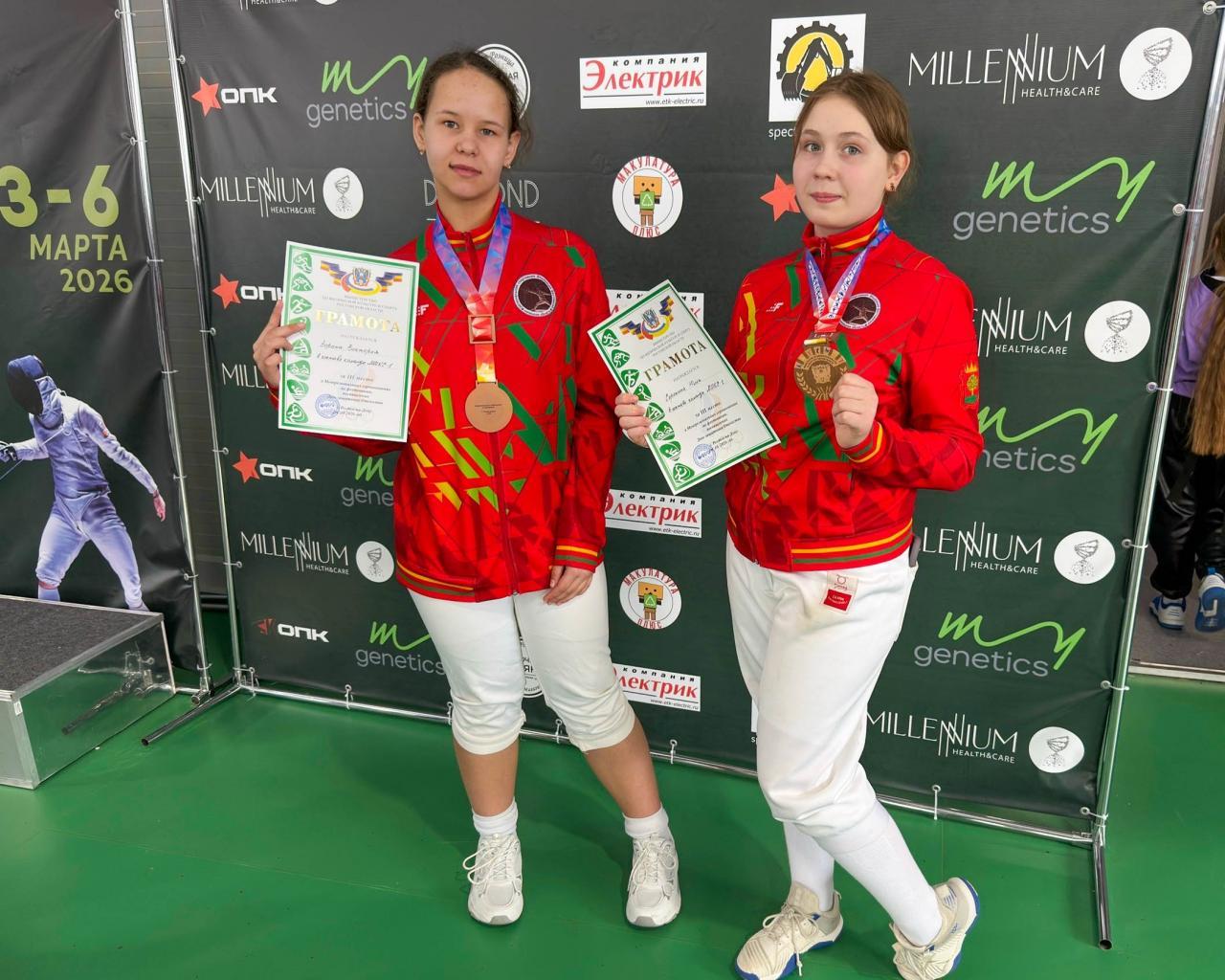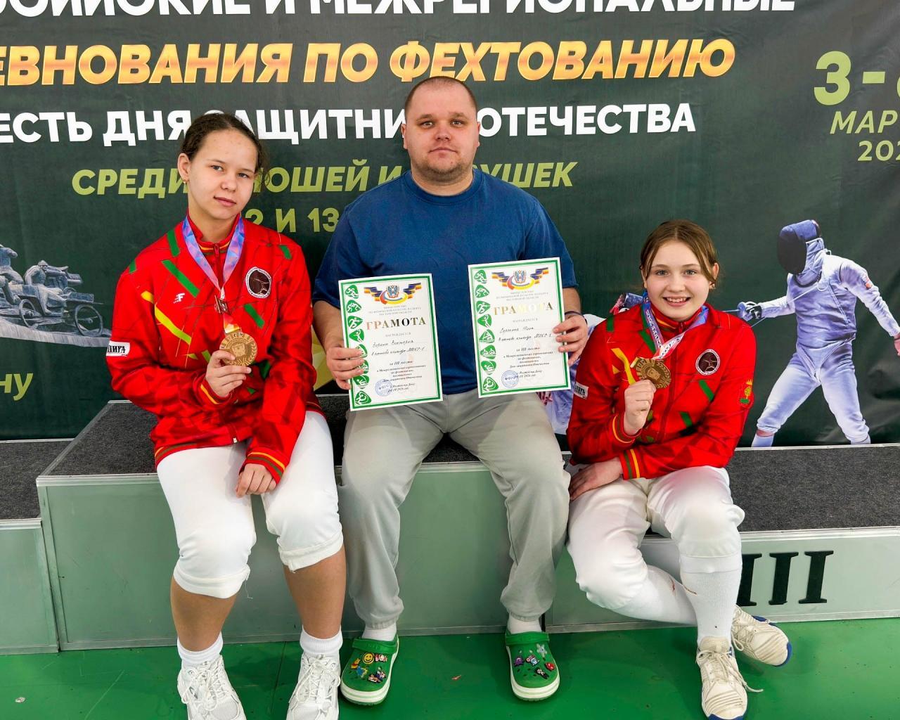 Виктория Зорина и Юлия Сорокина — бронзовые призёры в командном первенстве по женской рапире в категории 9–12 лет! Вместе с Авророй Коршиковой (Воронежская область) и Анастасией Ступницкой (Краснодарский край) они вошли в состав команды «микс-1», которая заняла 3‑е место среди 25 коллективов!